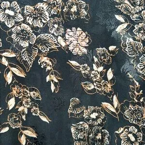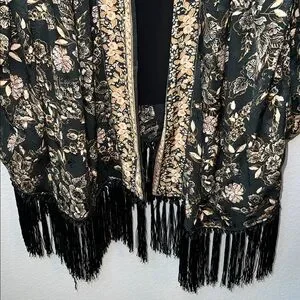 Chic dark green kimono with floral print. Black Fringe trim adds flair. Open front with contrast banding.
