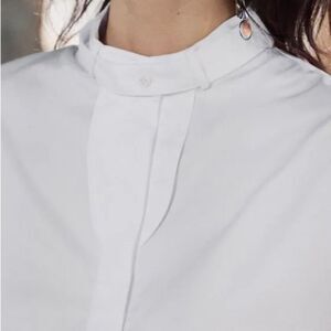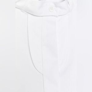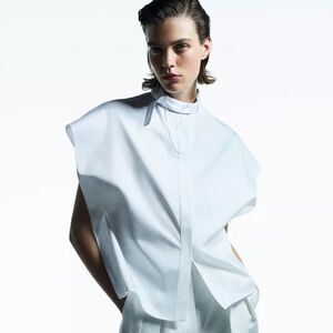 Cotton poplin shirt. Mandarin collar and self-fabric tie with loops and a button. Dropped short sleeves. Straight hem. Front fastening with hidden buttons beneath a placket.