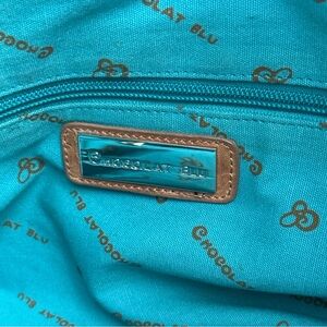 Beautiful Chocolat Blu tan woven leather shoulder purse or tote bag design with large turquoise three compartments interior and magnetic top closure in great condition. One outside zipper pocket on back. Comfortable hobo style with vintage leather look. Cleaned with leather