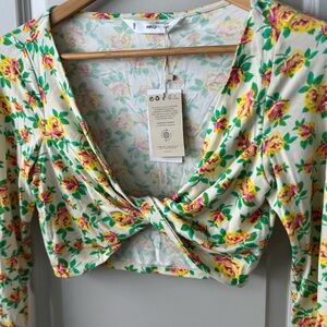 MANGO Women’s Bright Floral Printed Knot Long Sleeve Crop Top Size Large