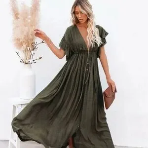 Flawless Flowy Bohemian Chic Forest/Olive Green Maxi Dress Size Small