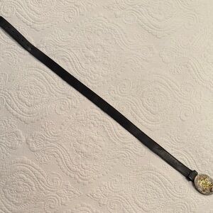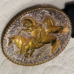 Fantastic Silver Creek leather belt with heavy plate horse buckle. Belt is 36” x 1-1/4”. The buckle is by Crumrine, heavy plate on jewelers bronze.