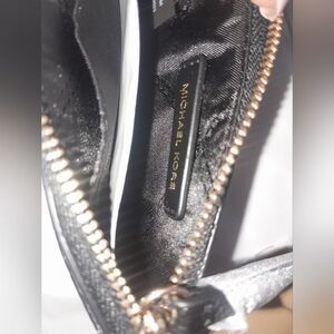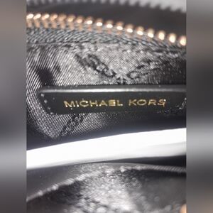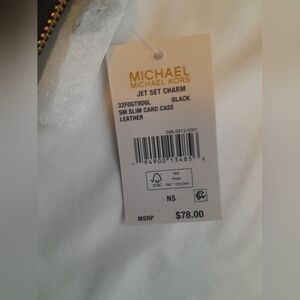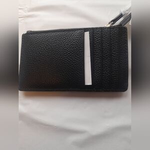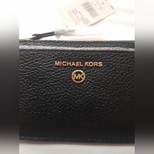 New Michael Kors Slim Card Case with 5 Card slots in outside and one on reverse side also has middle zipper pouch for change ect.Michael Kors. Please no copy.Features gold logo. Compact and stylish design. Messurements in photos. Black with Gone tone hardware.This is New with Tags.Would make a great gift