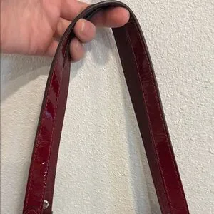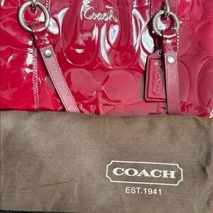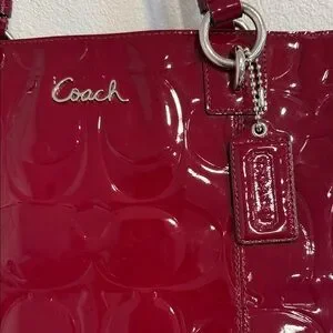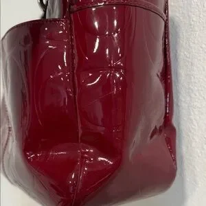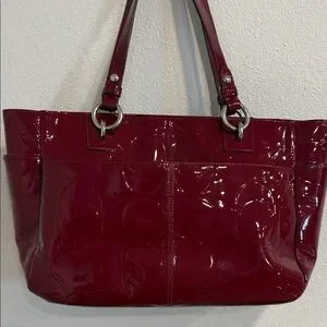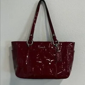 Sleek and stylish Coach shoulder bag in deep red patent leather. Perfect for adding a touch of elegance.