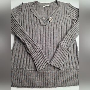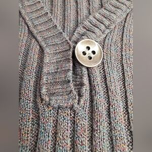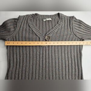 Chic heathered gray sweater with ribbed texture. Features a stylish V-neck and button detail. Gray with multi color knit. For a closer view check out the fabric label pic and you'll see the pretty color knit!