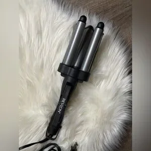 3-Barrel Tourmaline Ceramic Jumbo Waver in EUC. Creates long lasting waves with reduced heat damage. All hair types, 30 heat settings, up to 420 degrees. Tangle free swivel cord and locking ring for ideal storage.