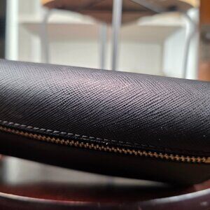 A black wallet from Michael Kors. In good shape overall, but please note there are some small spots of discoloration on the back and flap. The are light and difficult to show in photos and video. Small crack on inner flap.