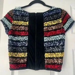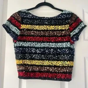 Dazzling sequin crop top with bold stripes. Features vibrant red, blue, yellow, and brown. Perfect for a night out.