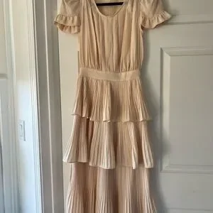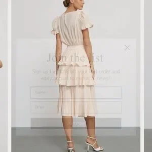 This chic cream tiered dress features elegant pleats and ruffled sleeves, perfect for any occasion. A stylish addition to your wardrobe. Paris Dress is a perfect blend of elegance and charm, made from airy, soft chiffon that drapes beautifully. It features short puff sleeves with delicate elasticated cuffs, finished with a small frill trim. The fitted waist creates a flattering shape, leading into a beautifully flared, pleated skirt. With a classic round neckline and a discreet back opening fastened with a button, this dress is ideal for any occasion, offering both comfort and timeless style.