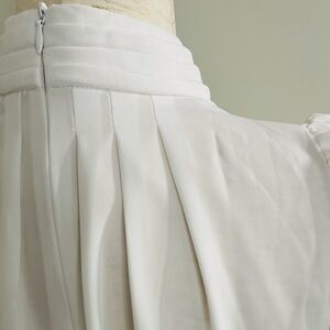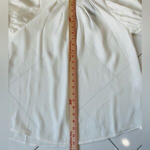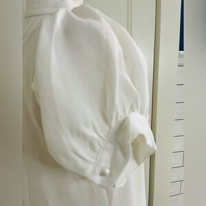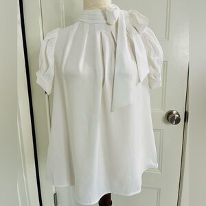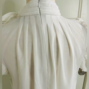 Chic ivory blouse with elegant pleats. Features a stylish bow accent and puff sleeves and pearl button detail. Perfect for versatile styling.