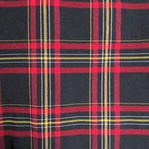 Black, red and yellow plaid pull-on stretch skirt. Front waist detail includes two decorative tabs and belt loops with black and silver buttons. Back kick slit.