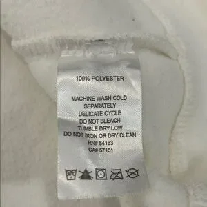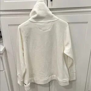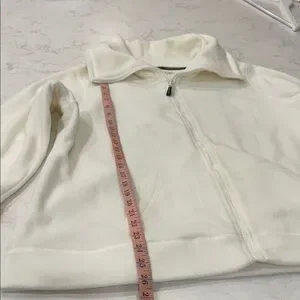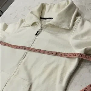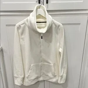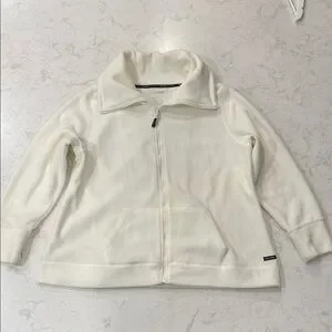 Cozy white zip-up jacket with a high collar and front pockets. Quick dry performance, smartphone pocket, headphone access.