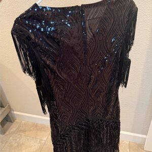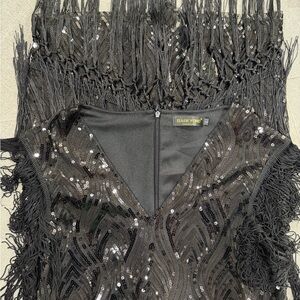 Step out in style with this elegant black sequin fringe dress. Perfect for any special occasion. A fun dress to wear!