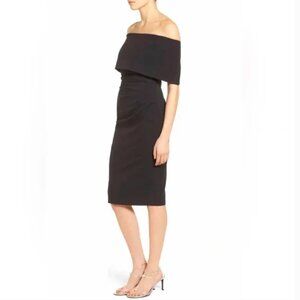 Vince Camuto, off the shoulder, black dress, cocktail, evening, formal, party, sheath, popover, ruched, strapless, NWT, size 6, polyester, little black dress, Princess Diana, revenge dress