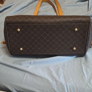 Design: It features a gentle dark gold "RR" RIONI monogram print on a solid brown designer canvas body, accented with leather trim and gold hardware.