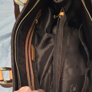 Interior: The interior is lined with coffee brown fabric featuring the RIONI monogram print and is divided into three separate compartments. It includes a cell phone pouch, a pocket pouch, and a zipper pocket.