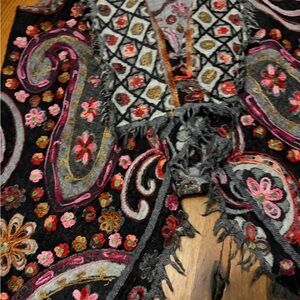 Anu 100% wool vest with embroidered paisley and floral patterns and fringe, features a mix of colors including black, gray, pink, and orange, great for layering, size Small