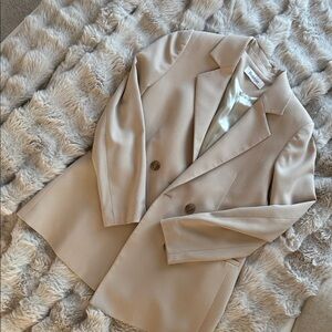Timeless beige blazer with a tailored fit. Features a double-button closure. Ideal for professional and casual settings. Missing tie waist belt that goes through loops