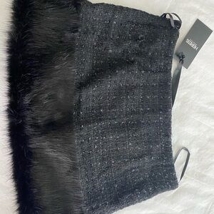 Chic and ultra-luxurious mini skirt by Heiress Beverly Hills, brand new with tags. This stunning piece features a structured black tweed body woven with subtle metallic threads for a touch of sparkle, finished with a plush faux fur trim along the hem for a glam, high-fashion look. Fully lined with silky satin and features a hidden side zipper for a sleek fit.