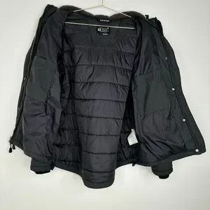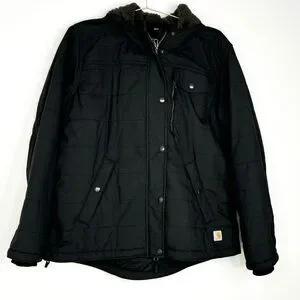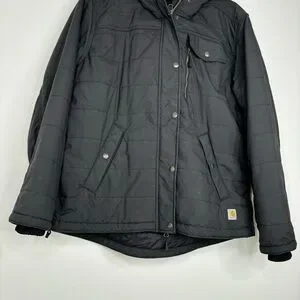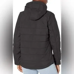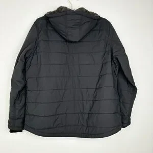 Stylish black jacket with hood. Features front pockets and zip closure. Perfect for cold weather.