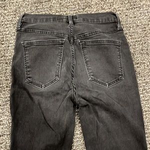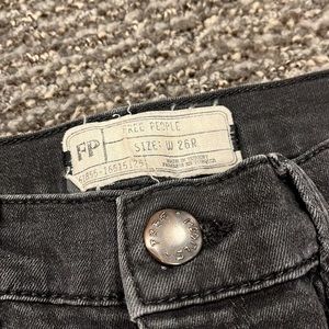 This is a pair of dark wash Free People jeans. They are a light black. They are a size 26r. There are no front pockets, just the back pockets. They are about about a 9 inch rise. Please review photos and inquire with questions. They back seat area is lighter than the legs.