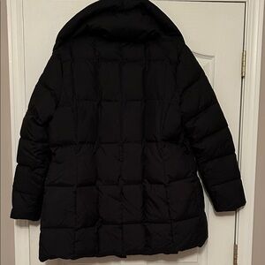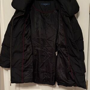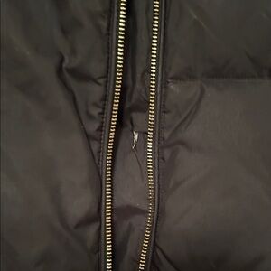 Elegant black puffer coat with a cozy design. Features a stylish oversized collar and zippered pockets. Well loved but in decent condition. Missing belt and top button by collar. Has a small tear on the inside/side of the zipper and at the top of one pocket. Make an offer!