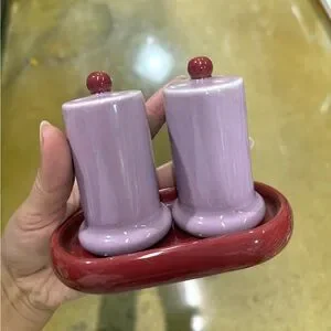 Includes one salt shaker, one pepper shaker, and one tray. Handpainted stoneware. Dishwasher safe. Imported.