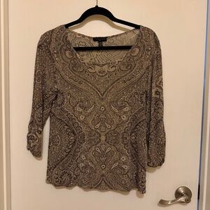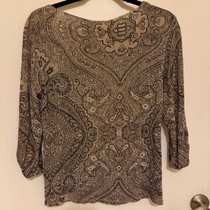 SCREAMING GLITTER AT YOU! 3/4 LENGTH SLEEVES WITH DISTINCTIVE RUCHING ADDS A TOUCH OF INTEREST. DRESS IT UP OR WEAR IT WITH JEANS. COMFORTABLE AND FASHIONABLE ALL AT ONCE.