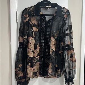Black and Rose Gold Sheer Floral Embroidered Button Up Women's Blouse size Large