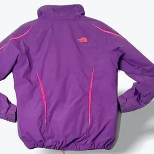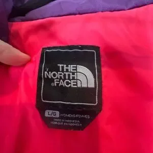 Keywords: North Face, winter jacket, ski jacket, insulated, purple jacket, pink accents, womens outerwear, outdoor gear, cold weather, athletic wear, fashionable, bright colors, activewear