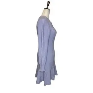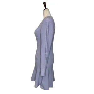 The Anthropologie Skater Sweater Dress in size M features a crew neck and long sleeves, perfect for the winter, fall, or spring seasons. The rib knit lavender dress with textured accents is ideal for both casual and party occasions. Made from a blend of polyester, cotton, wool, and acrylic, this fit and flare sweater dress offers comfort and stretch for a flattering silhouette. The short dress length of 34 inches and a waist size of 34 inches make it a versatile addition to any wardrobe with a preppy and classic style.