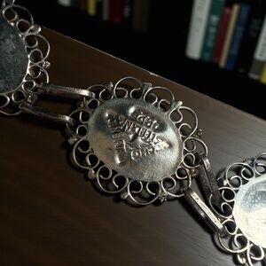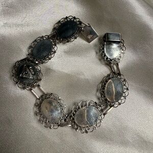 Vintage 1950s Sterling Silver from Guadalajara . Materials are on onxy and silver .Clasp is an alligator clip .you will not find this bracelet in America . I live on the Gulf of Mexico and am handpicking jewelry since I have home there . This beautiful is also stamped by artist