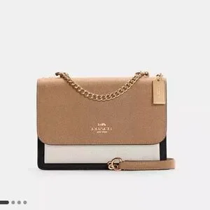 Stylish Coach crossbody bag. Features tan and cream colors. Gold chain detail. Perfect for any occasion.