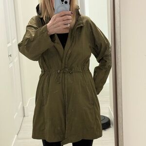Chic raincoat by J. Jill. Features a drawstring waist and zip closure. Pockets are zippered too. Comes with hood which snaps on and off. Totally cute! weatherproof yourself!!