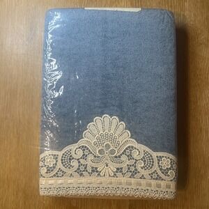 New old stock - vintage towel set in original packaging. Includes bath towel, hand towel and washcloth. Decorative bath set with lace, embroidery and ribbon.