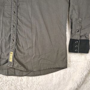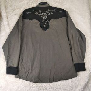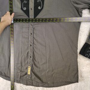 The Larry Mahan Cowboy Collection 2XL Western Shirt is a stylish and unique addition to any man's wardrobe. This gray shirt features a solid pattern with embroidered floral accents, giving it a touch of cowboy flair. The black snaps add a sleek contrast to the design, while the regular fit and long sleeves make it comfortable for casual occasions. Made from a polyester blend, this machine washable shirt is easy to care for and perfect for those who appreciate a blend of classic Western style with modern details.