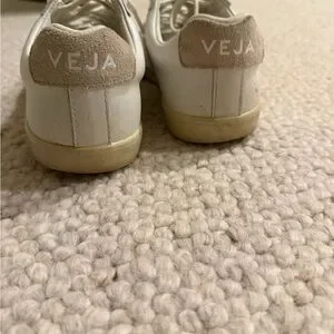 Stylish Veja sneakers with a cream and white design. Perfect for casual wear. Comfortable and chic.