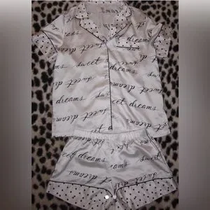 Chic pajama set with 'sweet dreams' script. Short-sleeve top and shorts. Perfect for a cozy night.