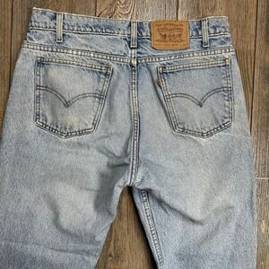 Levi's 505 Vintage 90s Jeans Light Wash Regular Straight Leg Distressed 33x27 (Tag 34x34 but measures smaller). Fair used condition - distressing throughout, hole on the pocket and some wear on the heel drag seen in the last two pics