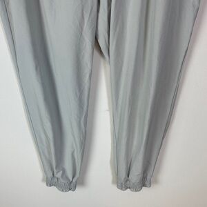 Gently Used Athleta Joggers. These are a women's 16. Light gray color throughout. Front pockets. Super lightweight. 86% recycled polyester, 14% spandex.