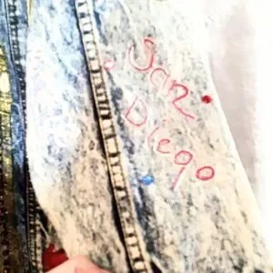 The jacket has an added inner lining, yet the original Jordache label and brass buttons remain visible underneath, preserving its authentic vintage character.