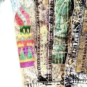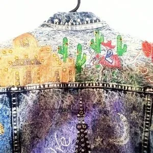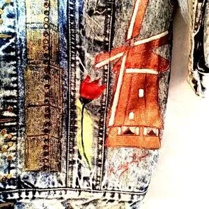 This one-of-a-kind vintage Jordache jean jacket has been creatively upcycled into a true wearable art statement piece. Made from 100% cotton denim in a classic acid wash finish, it features an elaborate hand-painted travel theme design embellished with colorful rhinestones throughout. Iconic landmarks and destinations from around the world are beautifully illustrated and accented for a bold, eye-catching look.