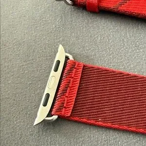 Elegant Hermes smartwatch band. Vibrant red color. Sleek design with silver hardware.