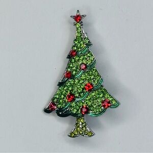 Add a touch of sparkle to your holiday style with this green and red rhinestone Christmas tree brooch! Featuring shimmering bright green crystals with vivid red accents and a matching red star topper, this brooch brings festive cheer to any outfit. The silver-tone metal base gives it a polished and elegant look that’s perfect for the season.