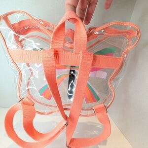 This vibrant butterfly-shaped kids backpack features a playful design with bright colors. Perfect for adding a splash of fun to any outfit. Still in good condition.