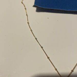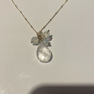 Elegant gold tone necklace and earrings set, perfect for adding a touch of delicate shimmer to your outfit. This set features a dainty necklace with a fine gold tone chain adorned with small, evenly spaced beads leading to a teardrop pendant made of iridescent clear faceted material. The pendant is further embellished with a cluster of small, round iridescent beads, adding to its ethereal charm. The set includes matching stud earrings, each featuring a single iridescent bead, completing the coordinated look. Ideal for a special evening out, a bridal event, or simply to elevate your everyday style.