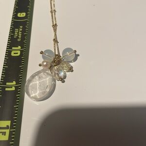 Keywords: Gold tone necklace, Stud earrings set, Iridescent beads, Teardrop pendant, Jewelry set, Wedding jewelry, Formal necklace, Dainty necklace, Gold jewelry, Evening jewelry, Gift for her, Fashion jewelry, Elegant accessories