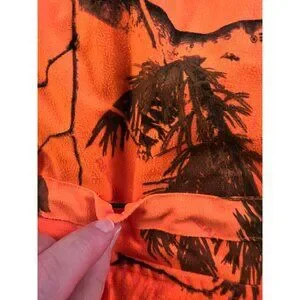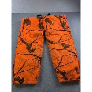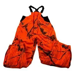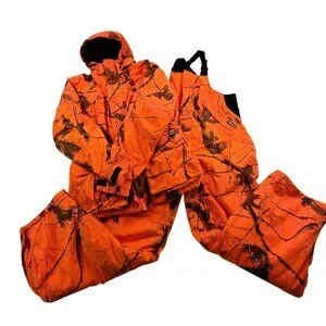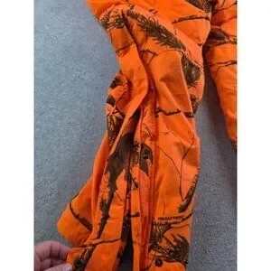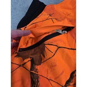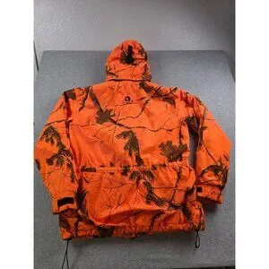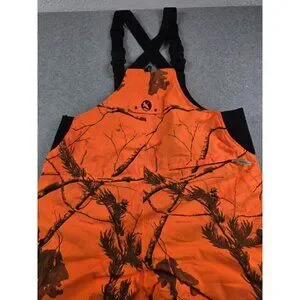Grander Mountain Men's Realtree Waterproof Tech20 Breathable Orange Camo Jacket And Bib Overalls Size LT Jacket Has a seam that came undone on the elastic cord for waist, easy fix but doesn't affect jacket. (shown in pics) in between legs has light wear. ( shown in pics)