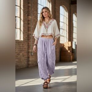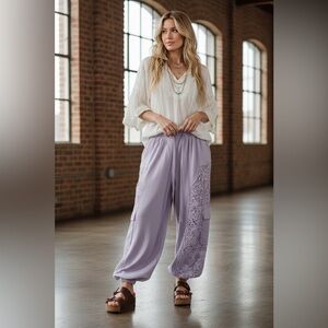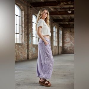 Lavender lace cargo pants with adjustable waist and jogger style, featuring a relaxed fit and a flowy design #boho