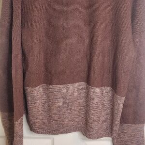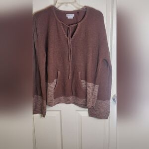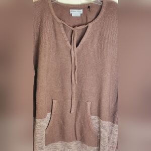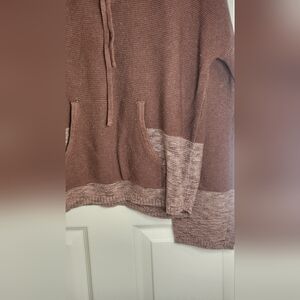 Cozy brown and tan knit hoodie with a relaxed fit. Features a front pocket and drawstring